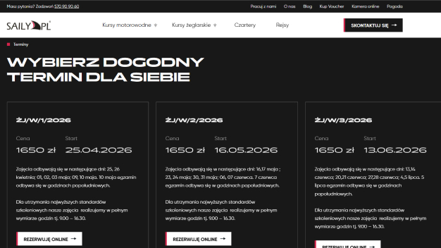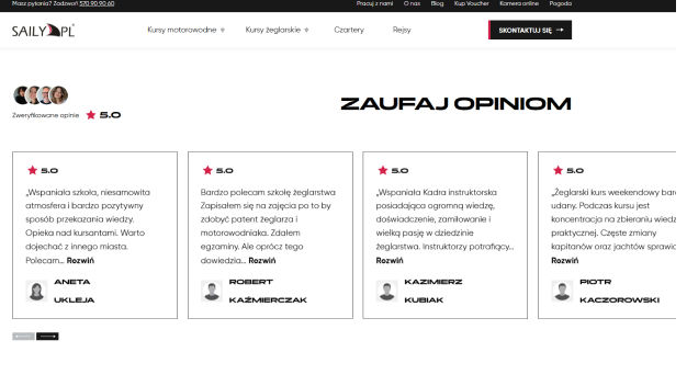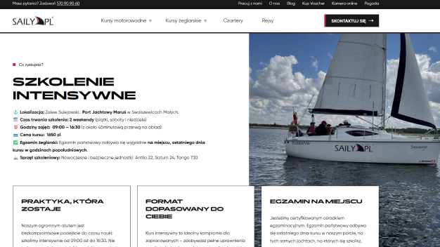 - Saily.pl to szkoła żeglarstwa i motorowodniactwa, która łączy szkolenia z realnym doświadczeniem przygody na wodzie. Klient potrzebował nowej strony, która nie tylko wygląda nowocześnie, ale przede wszystkim pozwala użytkownikowi zobaczyć, poczuć i zrozumieć, jak wygląda kurs zanim podejmie decyzję.
